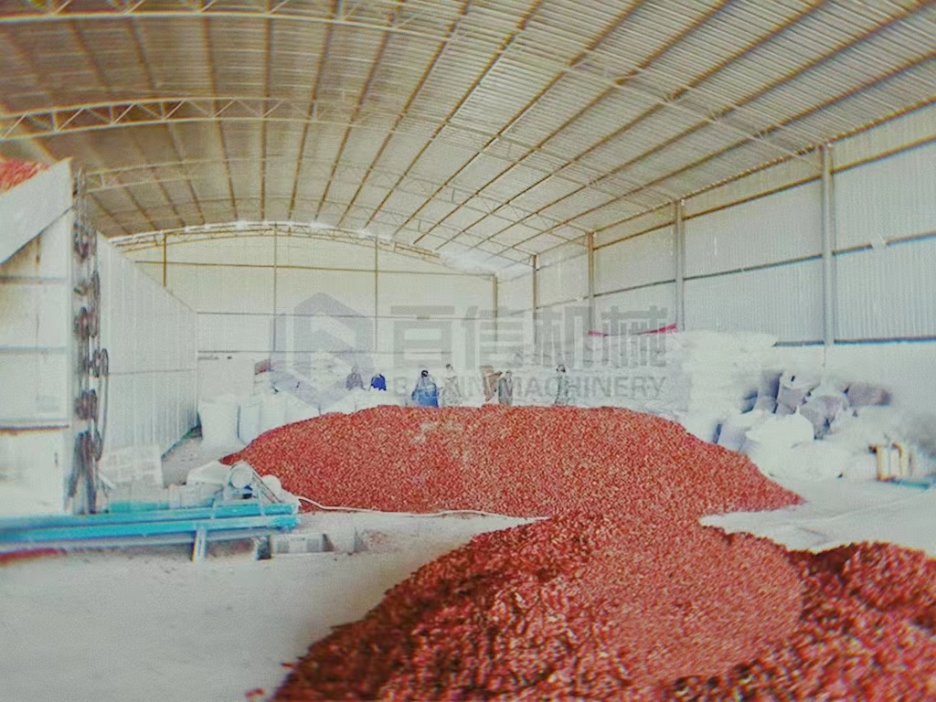 燈籠椒烘干機(jī)想要實(shí)現(xiàn)對(duì)物料的烘干,主要方式就是網(wǎng)帶烘干機(jī),將燈籠椒放置到輸送帶上,經(jīng)輸送帶上的均料裝置后,平鋪到烘干機(jī)網(wǎng)帶上,燈籠椒在烘干機(jī)內(nèi)由層逐一過(guò)渡到下一層,每層之間設(shè)置有導(dǎo)料和反轉(zhuǎn)裝置,使燈籠椒充分與載熱體接觸;辣椒從*一層流出。載熱體由風(fēng)機(jī)引入到烘干機(jī)內(nèi)部,引風(fēng)機(jī)產(chǎn)生的風(fēng)速、風(fēng)壓使載熱體充分、均勻的散布在烘干機(jī)底部,由于下部壓力大于上面壓力,載熱體向上運(yùn)動(dòng),穿過(guò)每層網(wǎng)帶,使燈籠椒與載熱體充分接觸,提高烘干效率。