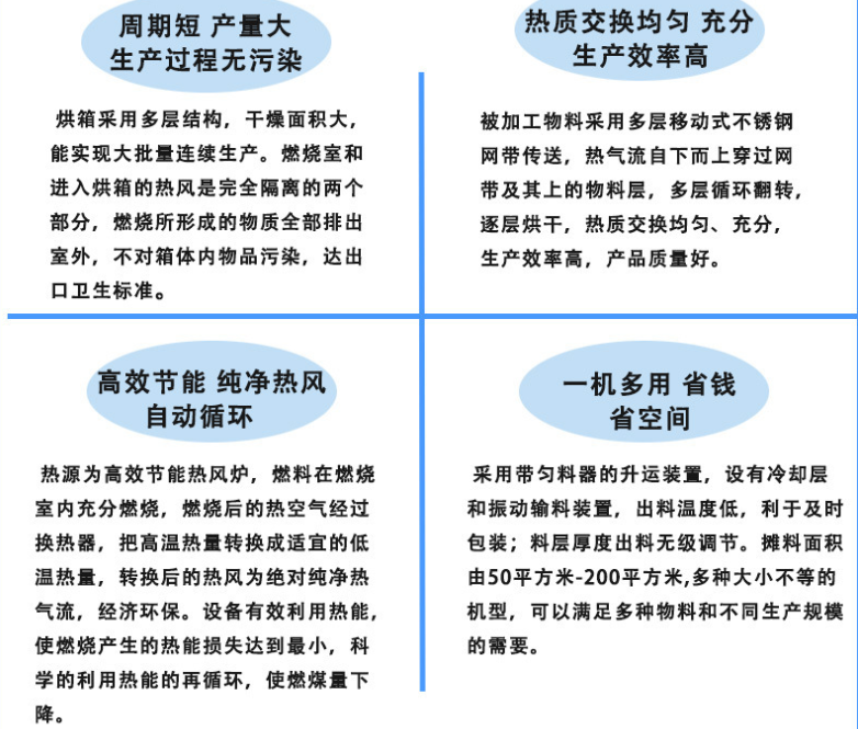 被加工物料采用多層移動式不銹鋼網帶傳送,熱氣流自下而上穿流網帶及其上的物料層,多層新歡翻轉,逐層烘干,熱質交換均勻、充分,生產效率高,產品質量好。